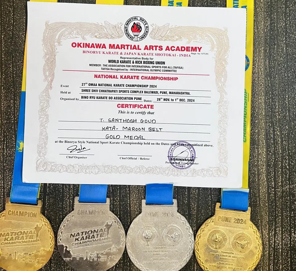 గత నెల 28 నుండి డిసెంబర్ 1 వరకు పూణే లో నిర్వహించిన జాతీయ స్థాయి కరాటే చాంపియన్ షిప్ పోటీల్లో తూoకుంటలోని శ్రీ విజ్ఞాన భారతి ఉన్నత పాఠశాలకు చెందిన విద్యార్థులు చక్కటి ప్రతిభ కనబరిచారు. పాఠశాలలో 6 వ తరగతి చదువుతున్న టి. సంతోష్ గౌడ్ పోటీలో పాల్గొని రెండు గోల్డ్ మెడల్స్, ఒక సిల్వర్ మెడల్ సాధించగా, 4 వ తరగతి చదువుతున్న కే దీపక్ కుమార్ సిల్వర్ మెడల్ ను సాధించారు.
